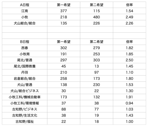 とはいえ塾目線で言えば、学校ごとで第一希望と第二希望の割合はチェックしています。例えば、江南高校は第一希望者の割合がとても高いです。トータルの倍率では1.54倍と他の高校と比べて低く見えますが、第二希望の割合が低いと受験者の母数はあまり減りません。