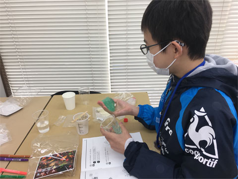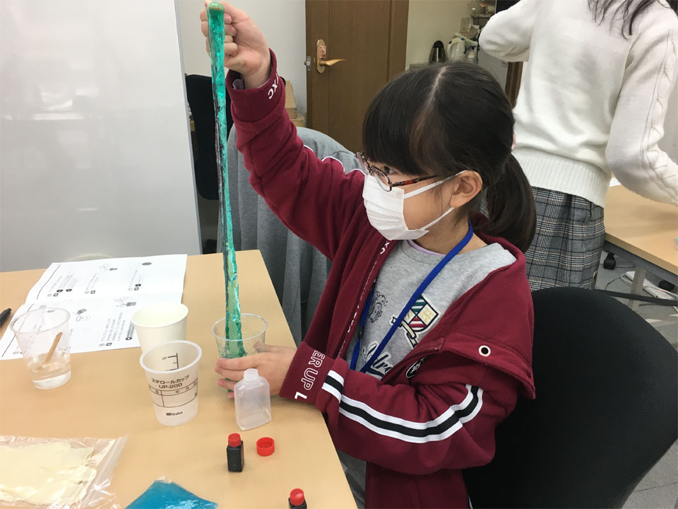 2020年3月30日に、春の理科実験教室として「スライム作り」を開催しました。洗濯のり(PVA)とホウ砂を混ぜ合わせることで、固体と液体の両方の性質を持つスライムを作りました。実験では水の量を調整して、硬さの違うスライムを作ったり、食紅を混ぜてカラフルな色のスライムを作りました。スライムを恐る恐る割り箸で触っていた子も、手に載せてみると「うわぁ〜」という表情に変わるのがとても印象的でした。実際に作って触ってみないと分からない感覚なんですよね。