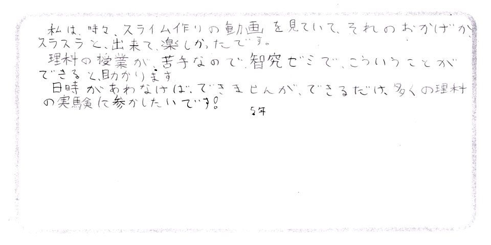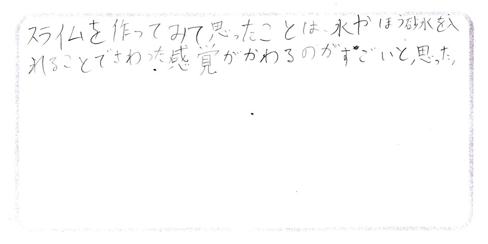 スライムのつくりかたは知ってたけど、さわったりつくったりするのは初めてで、たのしかったから又つくりたいです。